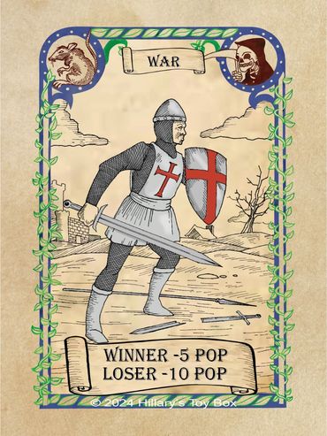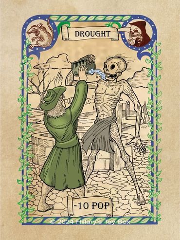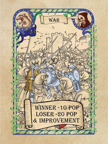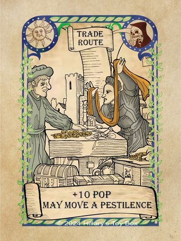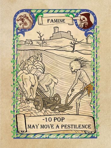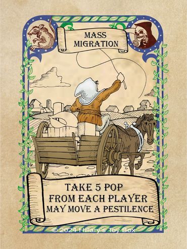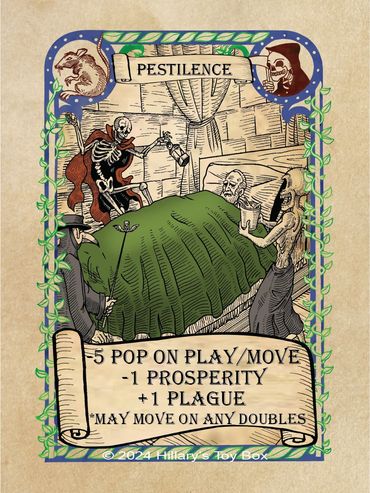 A player with an Pestilence card in play will gain a plus one (-1) modifier to a Prosperity Roll and a minus one (+1) modifier to a Plague Roll.