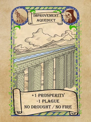 A player with an Aqueduct card in play will gain a plus one (+1) modifier to a Prosperity Roll and a minus one (-1) modifier to a Plague Roll.