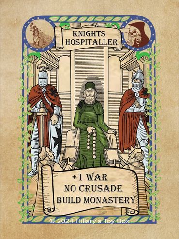 Player gains a plus one (+1)to any War roll.While the Knights Hospitaller is in play and the controlling player MAY NOT be the target of cards with Crusade in their name (Crusade & Children's Crusade).