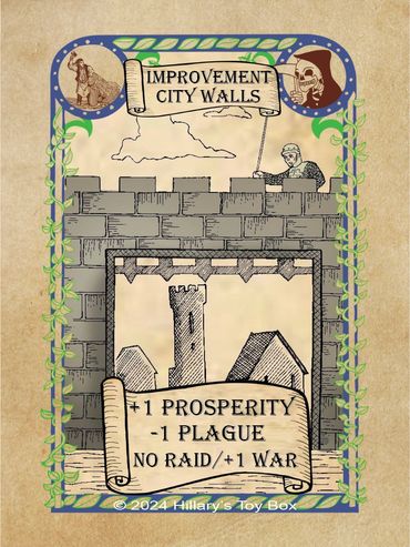 A player with a City Walls card in play will gain a plus one(+1) modifier to a Prosperity Roll and a minus one (-1) modifier to a Plague Roll.