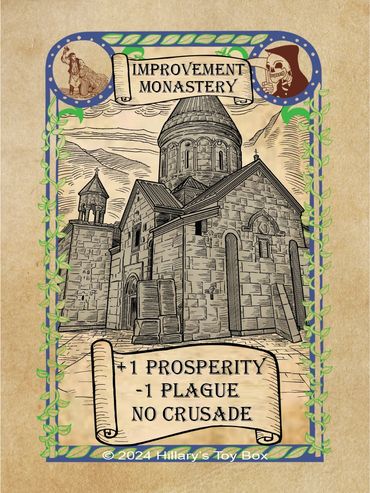A player with a Monestary card in play will gain a plus one (+1) modifier to a Prosperity Roll and a minus one (-1) modifier to a Plague Roll.